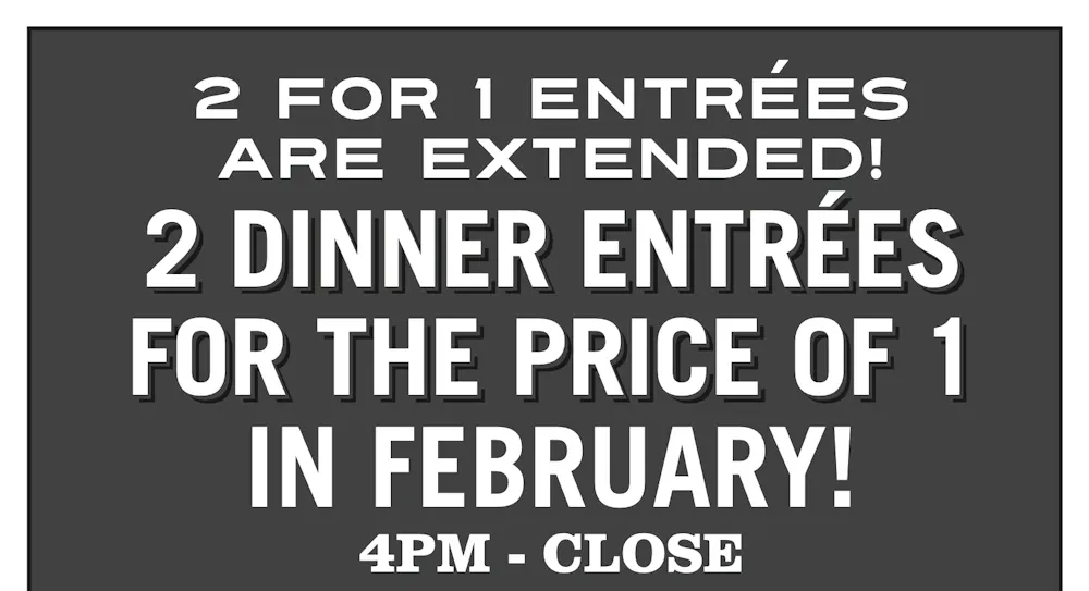 2 FOR 1 ENTRÉE OPTIONS FROM A LIMITED MENU. FREE ENTRÉE MUST BE OF EQUAL OR LESSER VALUE. DINE IN ONLY. NO COUPON OR RESERVATIONS NECESSARY. NOT VALID WITH ANY OTHER PROMOTION OR DISCOUNT.